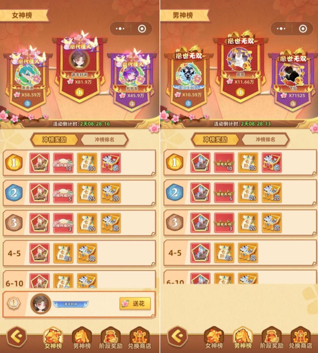 • 送花活动:该活动分为男女榜,女生买花不计入男神榜(消费榜),只有女生才能收花,鲜花 10 元宝朵。鲜花吃满轮数奖励为 40 万元宝(男女角色都一样),只有男角色买花的消费计入男神榜!男女角色冲榜奖励大差不差,女神榜的称号是加生命的,男神榜的称号加攻击!送花过后会活动送花积分,其中奖励有大乔,司马懿皮肤(99999 积分兑换)。剩下的是装自选,7 阶兵书,专武自选(均为 10000 积分兑换一个)