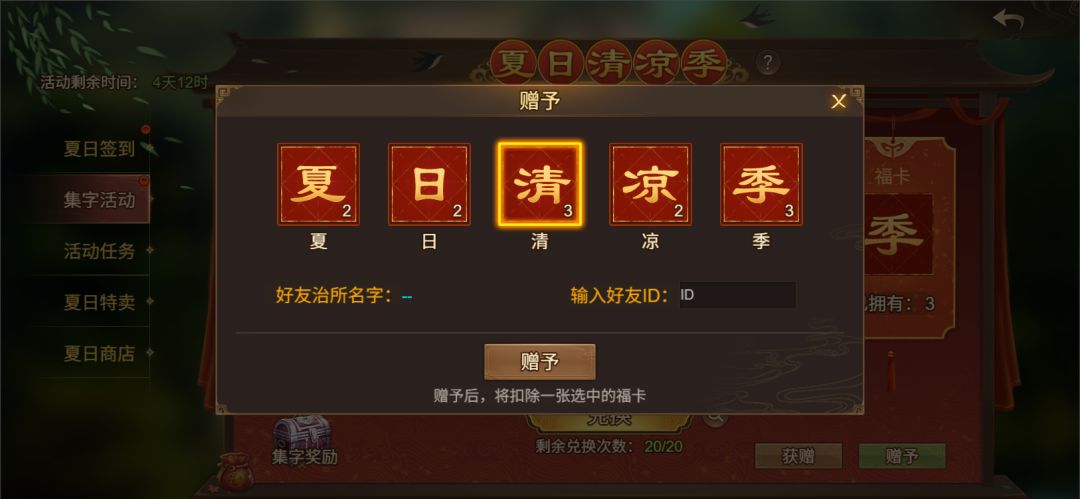 赠予好友:点击“赠予好友”,输入好友游戏ID并选择对应福卡即可赠予好友;