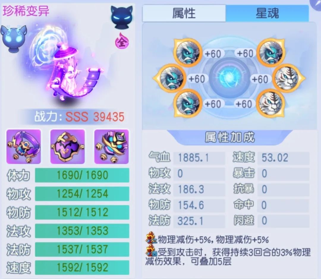 星魂属性以气血和速度为主,但属性稍显杂乱。套装为雪奴×4 + 羊小仙×2,提供极致物抗和生存能力,同时降低暴击伤害,非常适配这只宠物。