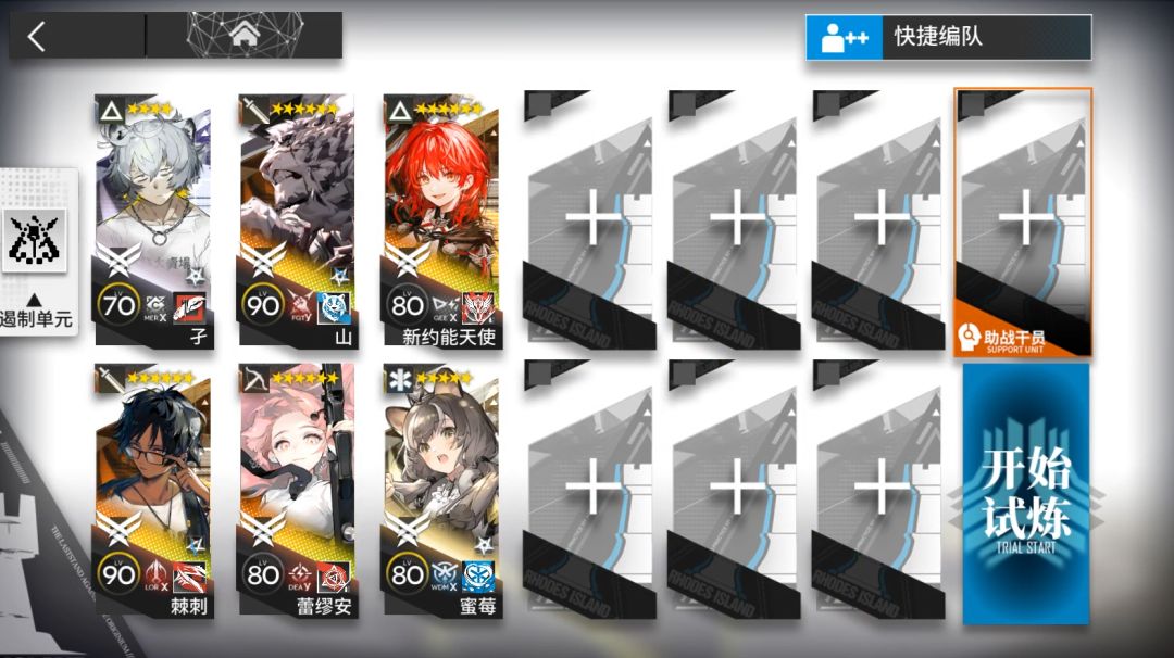 部署孑抗一下小怪,然后换山和能天使开技能挂机。棘刺挂了但蕾谬安靠2技能平A打死剩下小怪和boss。