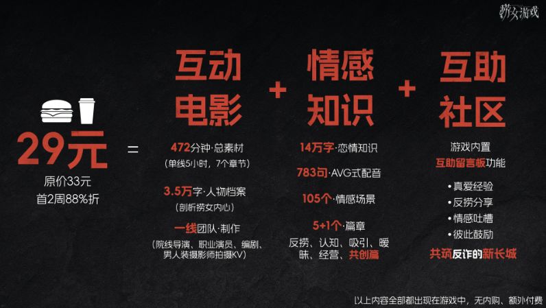 得益于互动影像游戏的代入感。玩家在游玩过程中可以非常直接地感受到制作组的良苦用心,这款游戏他们真的是带着“反诈”的使命感在做游戏。3.5万字的人物档案里,有许多对主线剧情和人设的进一步补全,你会看到在主线剧情以外每个角色遇到的现实困境,以及捞女行为背后的心理活动。14万字的恋情档案里,从反捞、认知、吸引、暧昧、经营五个章节分享情感知识,满满的干货分析,从心理学角度告诉你如何反捞、如何看待对异性的爱慕之情,如何正确处理和经营亲密关系。这部分内容的分量远远不是29元可以衡量的,它早已超出了一款游戏的范畴,让人肃然起敬。可惜制作组构想中的反诈新长城——留言板已经被举报下架,期待未来回归的那一天。