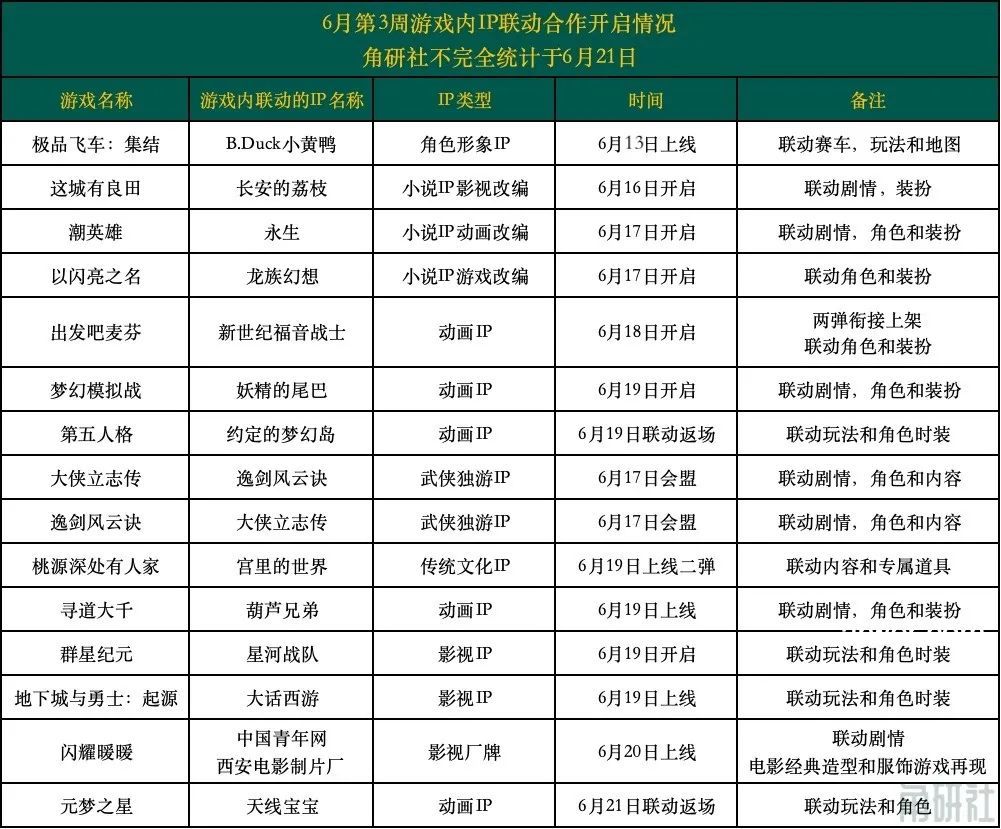 和之前几周不同的是,随着高考结束、暑期临近,游戏影视文旅都将迎来高峰期,投射到本周上线的15起游戏内IP限时联动活动,影视文旅IP的占比增大。