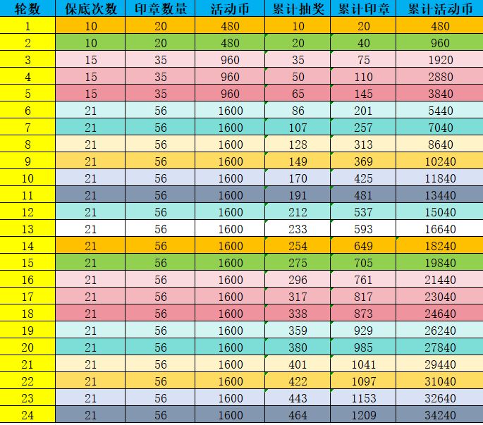 我又来了,因为我个人目前养成情况感觉魂师暗器更新换代太快了,用琉璃活动加快养成速度好像对屯屯鼠意义没那么重要了,现在更倾向于搞硬件,所以研究了下10轮大奖神话外附跟抽完260次要多少抽,然后就做了份表格(图3)顺便分享出来吧,总结就是260累抽要655个左右印章,到第十五轮第一层,也可以抽完十五轮705个,要囤六七个月,这种适合屯屯鼠高战搞稀有硬件的,战力低刚出村的还是继续小囤搞前面几轮,需要的数量也可以看表格
