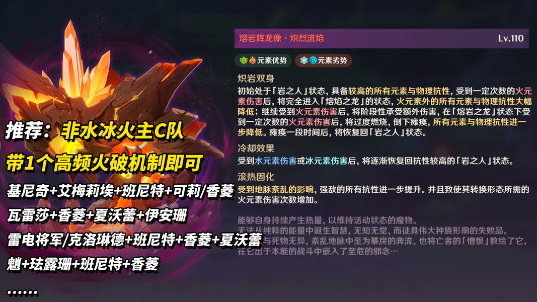 【推荐队伍】熔岩辉龙像是本期最容易的BOSS,可给另外两队匀出更多角色。只要不是火冰水C都能用,最低配可考虑阶段一带上香菱班尼特破机制,例如: