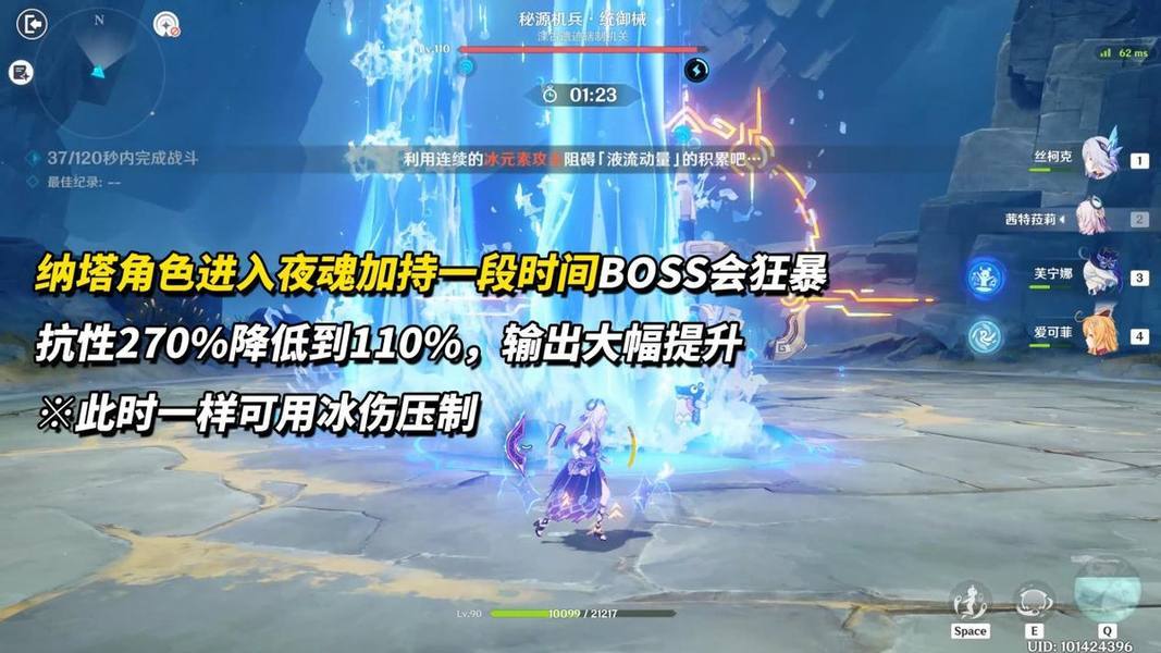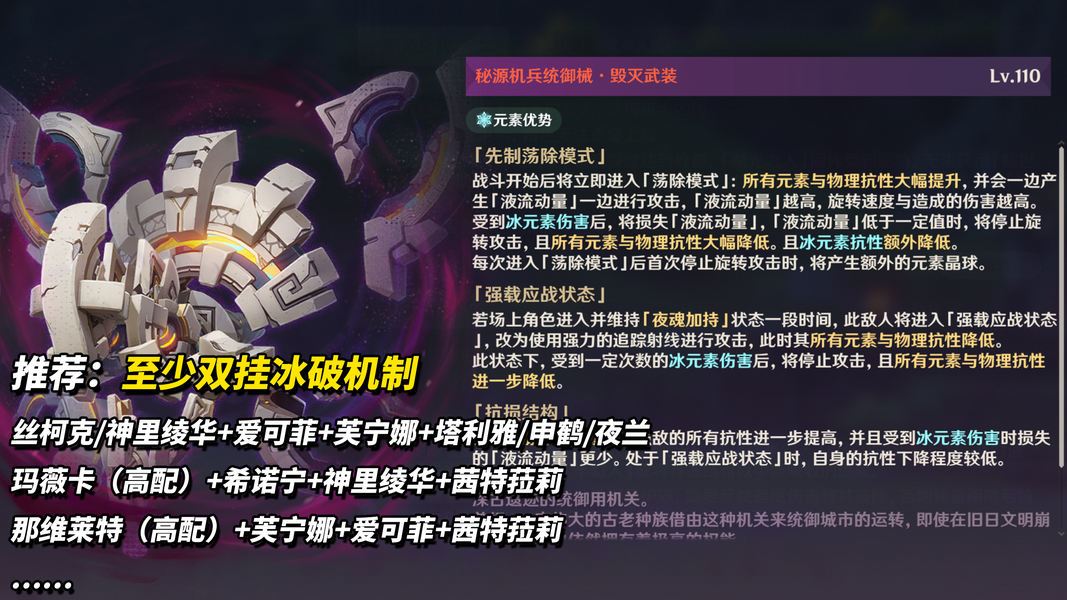 若是检测到有纳塔角色持续处于夜魂加持状态,BOSS会进入应战状态,将抗性从270%降低至110%,代价则是伤害大幅提升,在此期间同样可通过高频冰伤进一步降低其抗性。