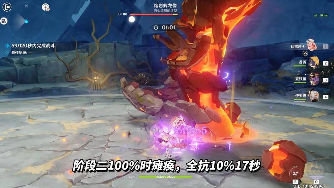 阶段一「岩之人」200%全抗,可通过火元素攻击可积累迫使其切换阶段二。此刻不关注输出,主要让可挂火角色登场输出,如草火燃烧、香菱、可莉等等,目的是快速跳过阶段一的高抗阶段,纯拼减抗辅助也很难打得动。※水冰伤害会降低积累值,不推荐带!