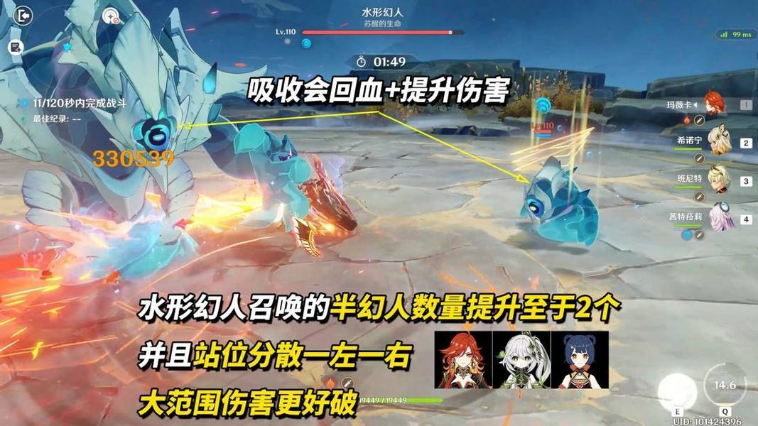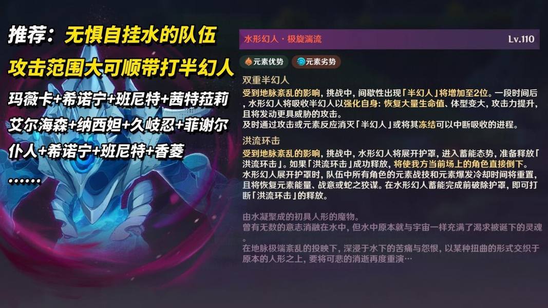 战斗途中,水形幻人召唤的半幻人提升至2个且站位分散。为避免被水形幻人吸收召唤物恢复血量,尽量携带攻击范围较大的角色,在不影响输出的情况下,顺带消除半幻人。可通过元素反应或伤害消除,冻梨推荐:玛薇卡、纳西妲、香菱。