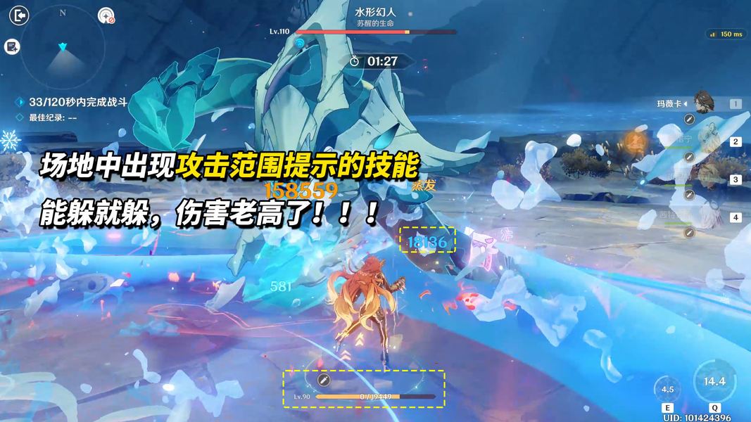 战斗途中多注意地上的范围水圈,一般为高数值伤害,有一点延迟时间给你闪避。特别是配队带班尼特的玩家,大招圈内自挂火,蒸发伤害接近2万。