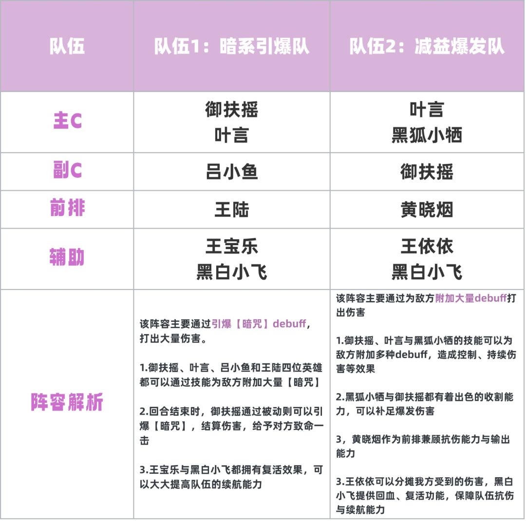 御扶摇作为【暗咒】体系的核心,我们不妨围绕她搭建阵容,其他队员可以不断为敌方堆叠【暗咒】debuff,再由御扶摇引爆打出高额伤害。以下是根据御扶摇特性制作的阵容推荐,仅供参考哦~