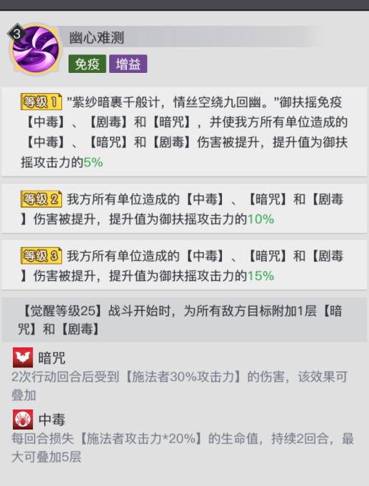 ”紫纱暗裹千般计,情丝空绕九回幽。”技能满级时,御扶摇免疫【中毒】【剧毒】和【暗咒】,并使我方所有单位造成的【中毒】、【暗咒】和【剧毒】伤害被提升,提升值为御扶摇攻击力的15%。
