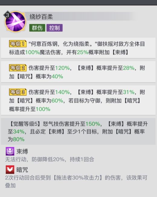 这个技能可以一次性为敌方附加多个debuff,兼具控制与输出。作为可覆盖全体的群伤技能,其叠加debuff的效率非常高,觉醒等级达到5后,每次释放必定至少【束缚】一个目标,使该技能可以提供非常稳定的控制减防效果。