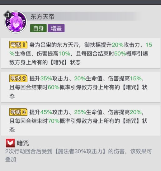 身为吕宙的东方天帝,技能满级状态下,御扶摇提升45%攻击力、25%生命值、伤害提高20%,且每回合结束时70%概率引爆敌方身上所有的【暗咒】状态。