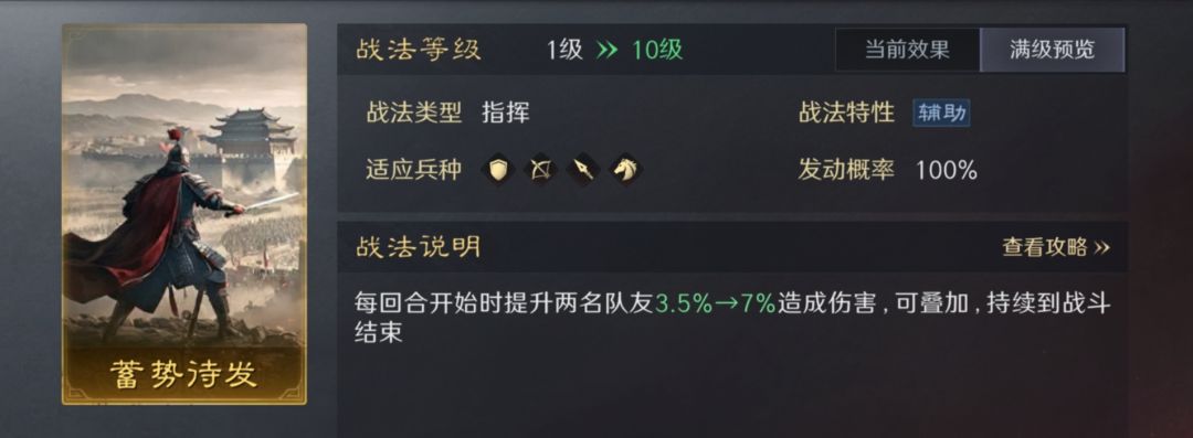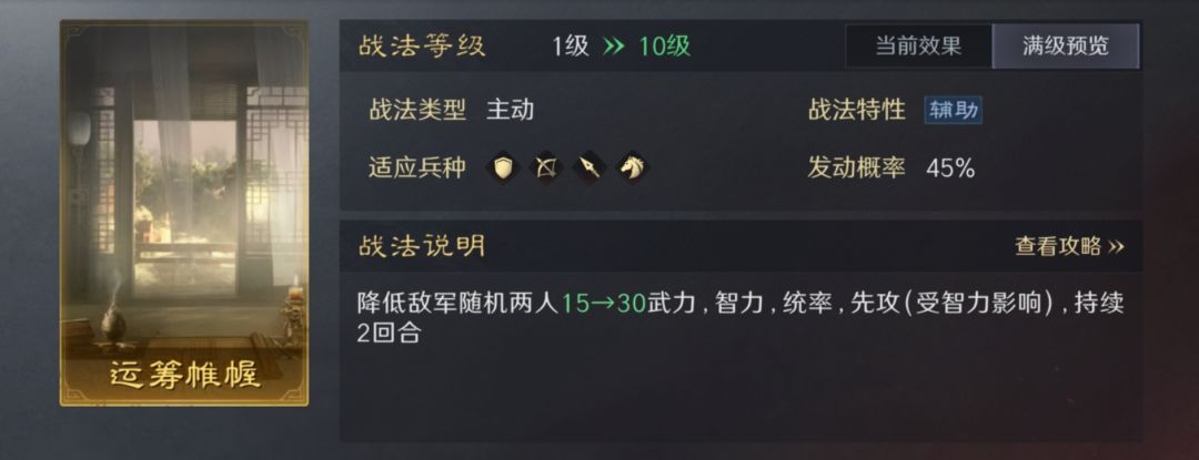 战法方面,“运筹帷幄”可替换为“断戈夺锋”,但考虑到需要5队共存,与第五队的“五谋臣”体系有稍许冲突,所以选择了“运筹帷幄”;韬略方面则都是增加主动战法发动概率,保证战法稳定触发,打出负面效果,对女儿队和追击队有一定的克制作用