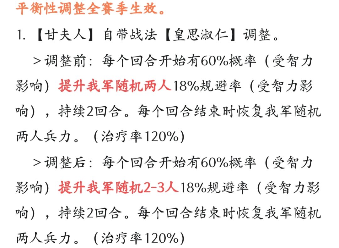 解读:比较经典的反击阵容,6.24日版本更新,甘夫人迎来了一波加强,自带战法【皇思淑人】从“固定提升2人规避率”调整为“提升2-3人规避率”,可以让全队都吃到规避率加成,在6.24更新之前这支队伍强度就不错,而这次更新也是变相增加了这支队伍的坦度,而且也不是特别吃红度,完全可以作为三队,值得一玩