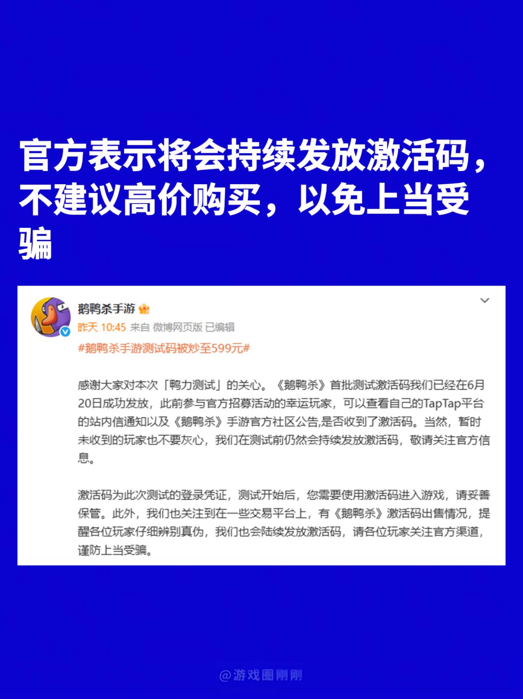 刚刚!鹅鸭杀首测激活码被炒至600元!