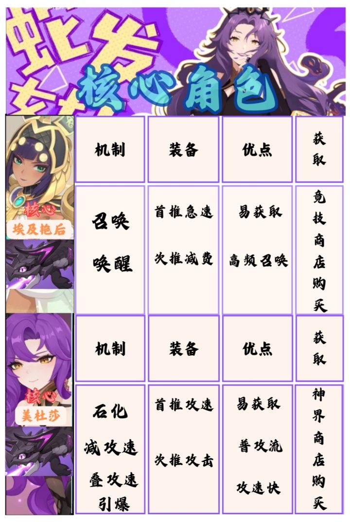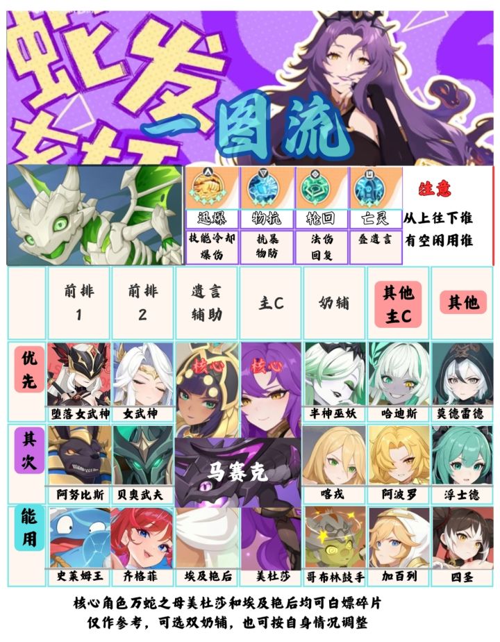龙放错图了,用彼岸龙,后面会改回来。本期小编带来的是彼岸阵容的二队攻略。登录福利里面的万蛇之母签到免费获取,想必各位持戒者也都想了解美杜莎的配队攻略。其整体机制:我方单位(召唤物)死亡时获得遗言效果强化自身。