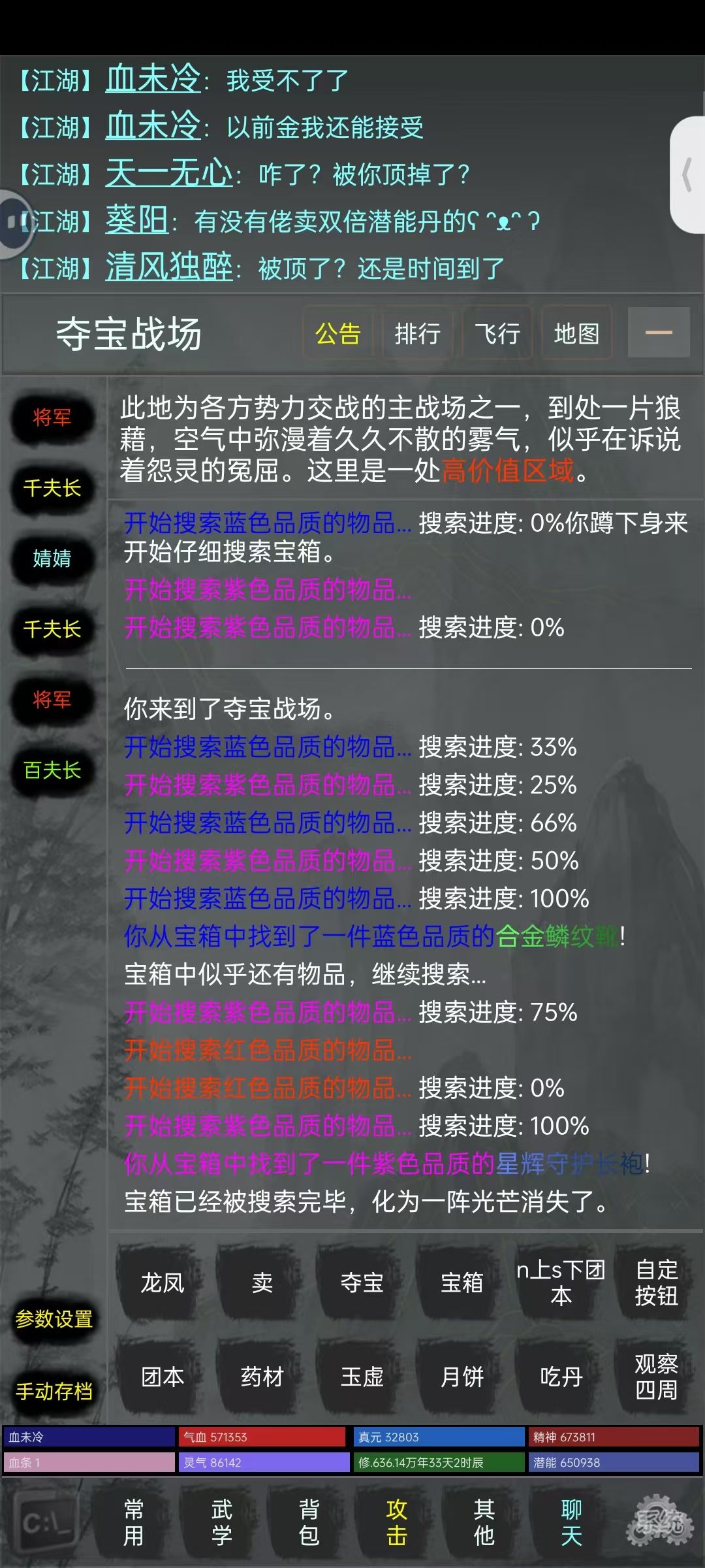 重中之重!夺宝战场死亡全掉落,所以萌新第一次进战场切磋小兵和百夫长即可(不要叫杀!!夺宝战场的怪血很少,切磋也可以杀死),在自身不掉血或者掉血不严重,且属性基本达标的情况下,可以尝试切磋千夫长。(萌新不要挑战将军的威严!哪怕是切磋都别点!)PS:已经不知道有多少人死在将军手里了,包括但不限于萌新。