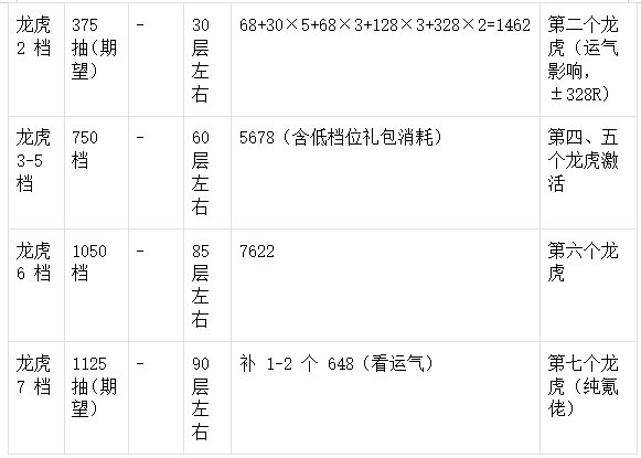 - 中氪:龙虎 1-2 档(550-1462R,18-30 层),激活龙虎核心古董,配合传说层 375 抽冲属性。