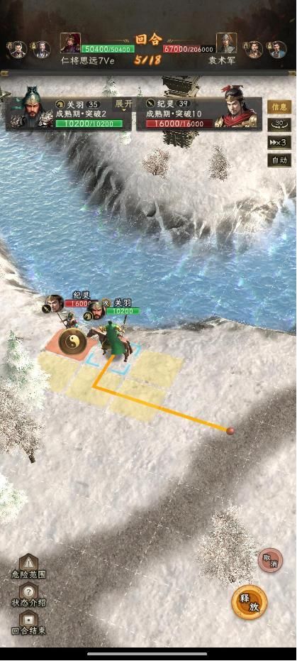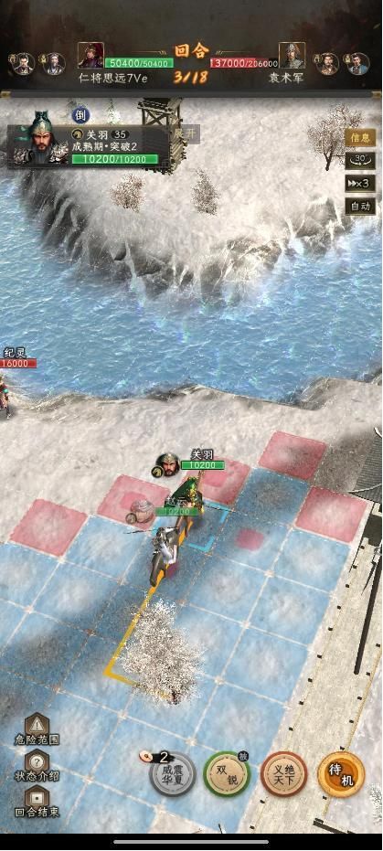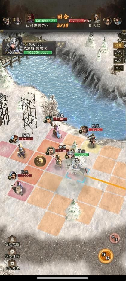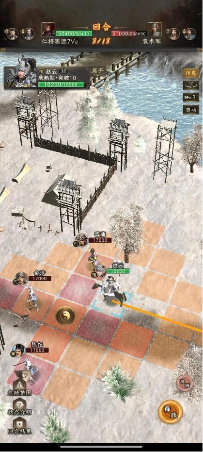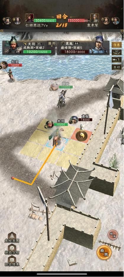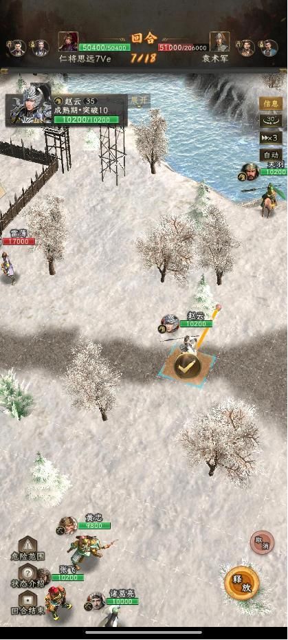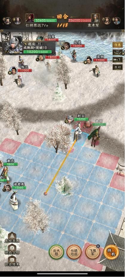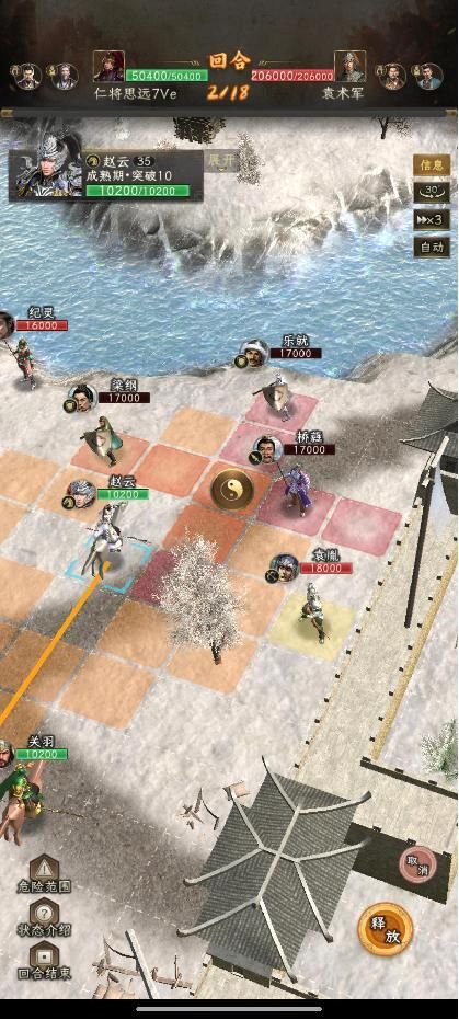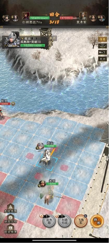 寿春对面12员将领,AI为发呆模式,只要不进AI的攻击范围,AI就不会动。对面的站位正好七进秒人的点有三个,适合逐次解决。对面物防最高的是纪灵(物防2061,血量1万6千),赵云秒不掉,需要关羽助刀。其中俞涉要注意一下,有一个三格射程的弓兵技能,比危险范围大一格,别不小心走进他的技能范围了。