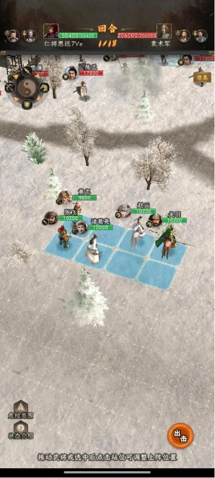 第七回合,赵云下移2格,放怒。注意这个位置,刚好在雷薄的攻击范围之外,而且刚好在俞涉的技能范围之外