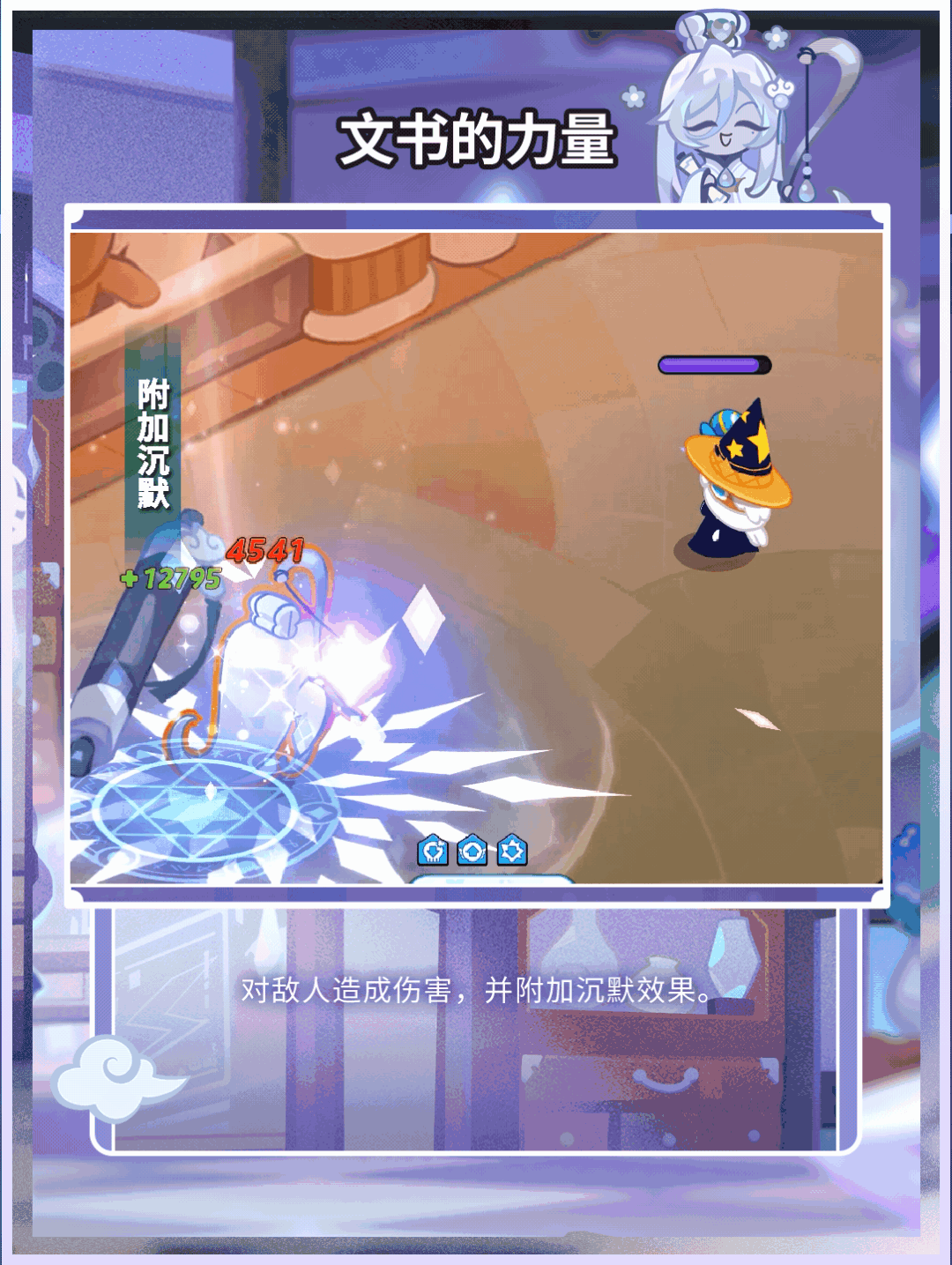 为我方持续恢复生命值,提升我方全体伤害减免与延长增益效果,缩短减益效果持续时间,同时根据我方损失的生命值,额外恢复一次生命值。当卷轴完全展开时,对敌人造成伤害,附加沉默效果。