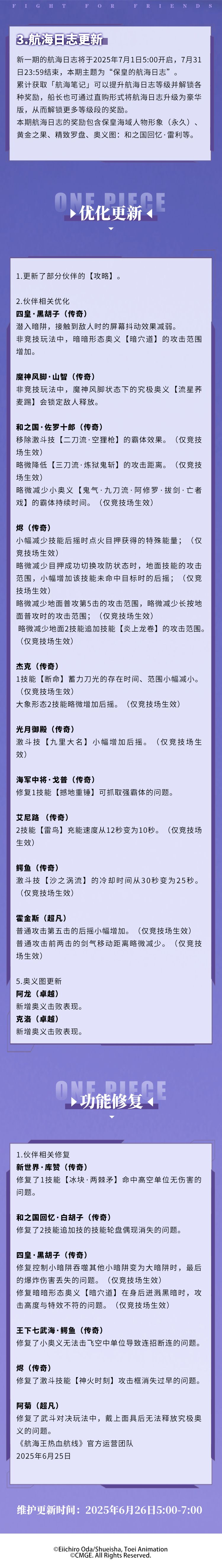每周例行维护,夏日福利季开启,百位竞技伙伴免费游玩,还有和之国罗宾专属按键等你领取!全新超凡载具吉贝克之剑号限时上架,更有超多海域形象亟待解锁!