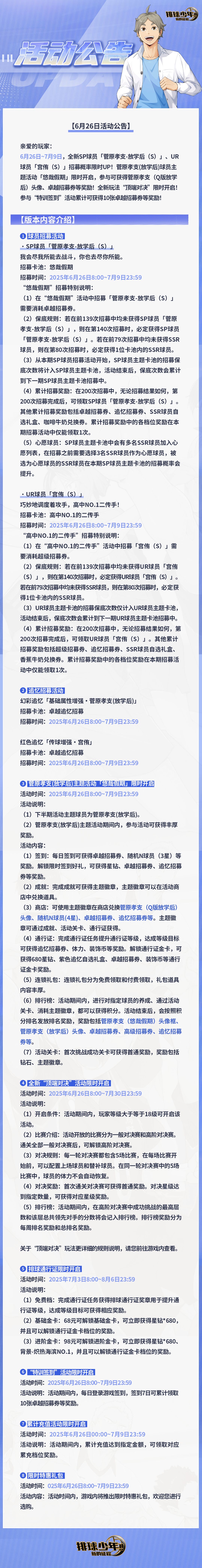 6月26日 ~ 7月9日,新SP球员「菅原孝支 - 放学后(S)」、UR球员「宫侑(S)」招募概率限时UP!菅原孝支(放学后)主题活动「悠哉假期」限时开启,参与可获得Q版头像、卓越招募券等奖励!