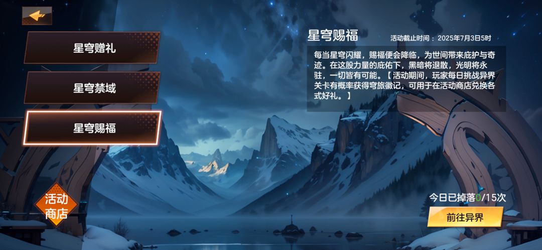活动期间,冒险者每日挑战异界关卡有概率获得穹旅徽记,可用于在活动商店兑换各式好礼。