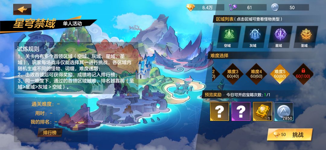 1、关卡内有多个首领区域(空域、灰域、星域、圣域),冒险者每场战斗仅能选择其一进行挑战,各区域内随机生成不同的怪物、词缀,难度递增;
