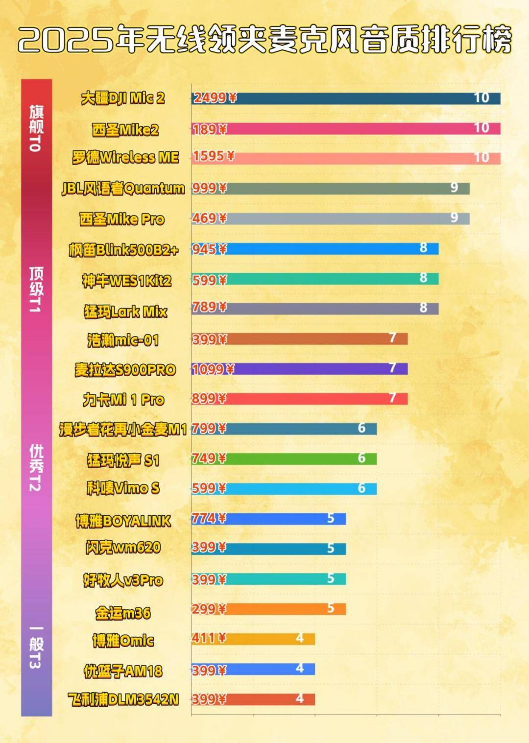西圣Mike2麦克风团队是国内罕见的富有匠人精神的团队,他们拥有十几年的音视频技术经验,始终在收音音质上不惜成本、精益求精,深入钻研调音算法。他们从零起步,投入重金搭建国内少有的高标准声学实验室,致力于追赶并媲美国际大牌的收音音质,同时不断尝试实现无限接近无损传输的效果。并且花20%的价格可以买到千元级大牌的水准!这款迷你麦克风仅重10克,采用创新磁吸设计,支持双人同时对话。内置发烧级Ai降噪DSP芯片,信噪比>70dB,配备加强版全指向AI感知麦克风,实现48kHz/24bit高采样率。即使在200米距离外,也能清晰稳定收音。续航长达30小时,兼容多种设备,包括相机、移动设备、平板和电脑。性能卓越,遥遥领先于行业水准。款式2:大 疆DJI Mic 2评分:9评价:音质出色,功能全面
