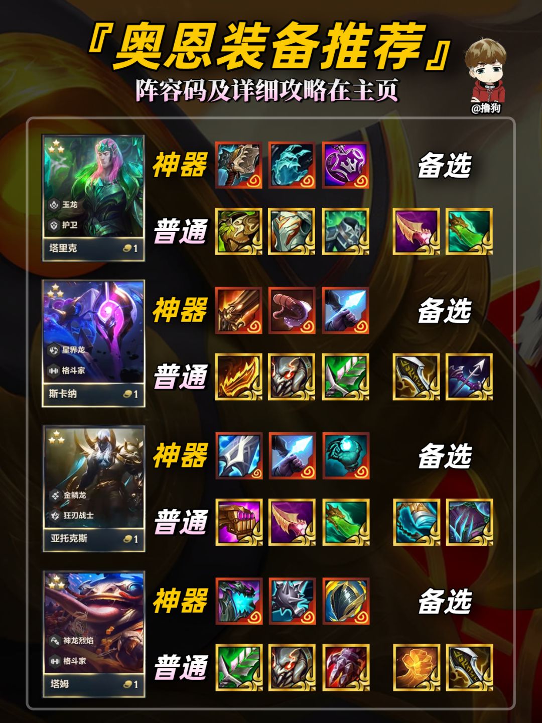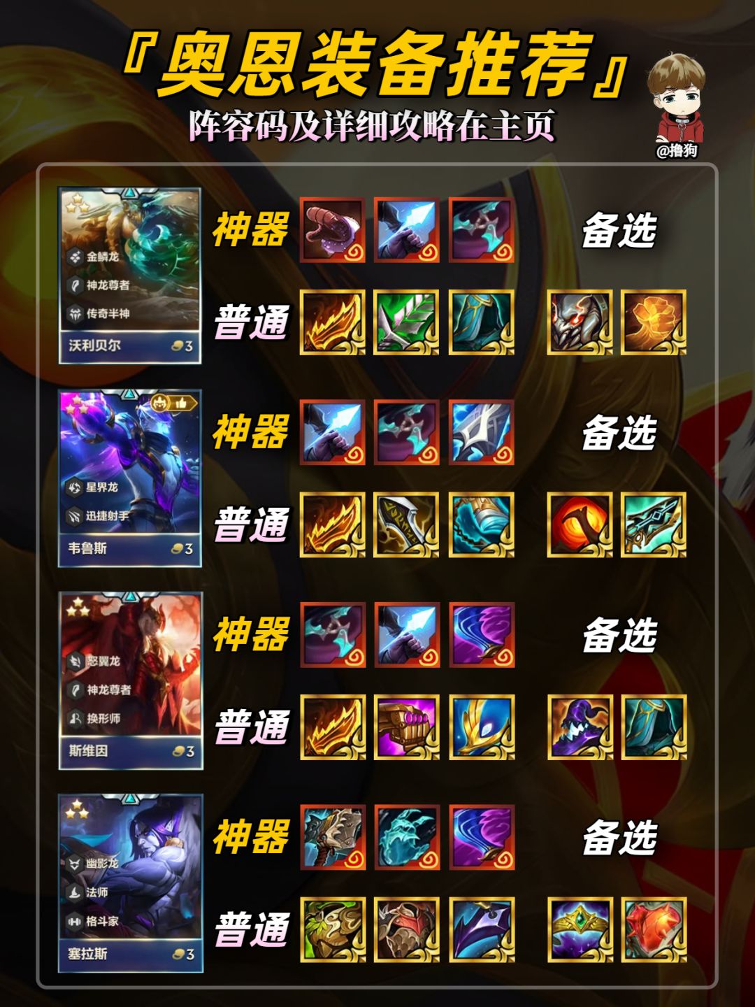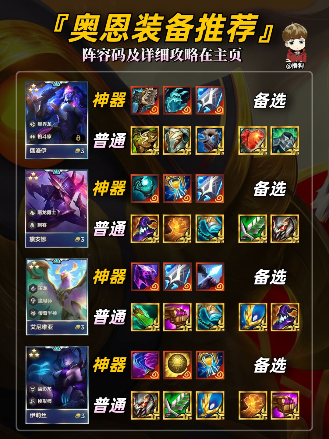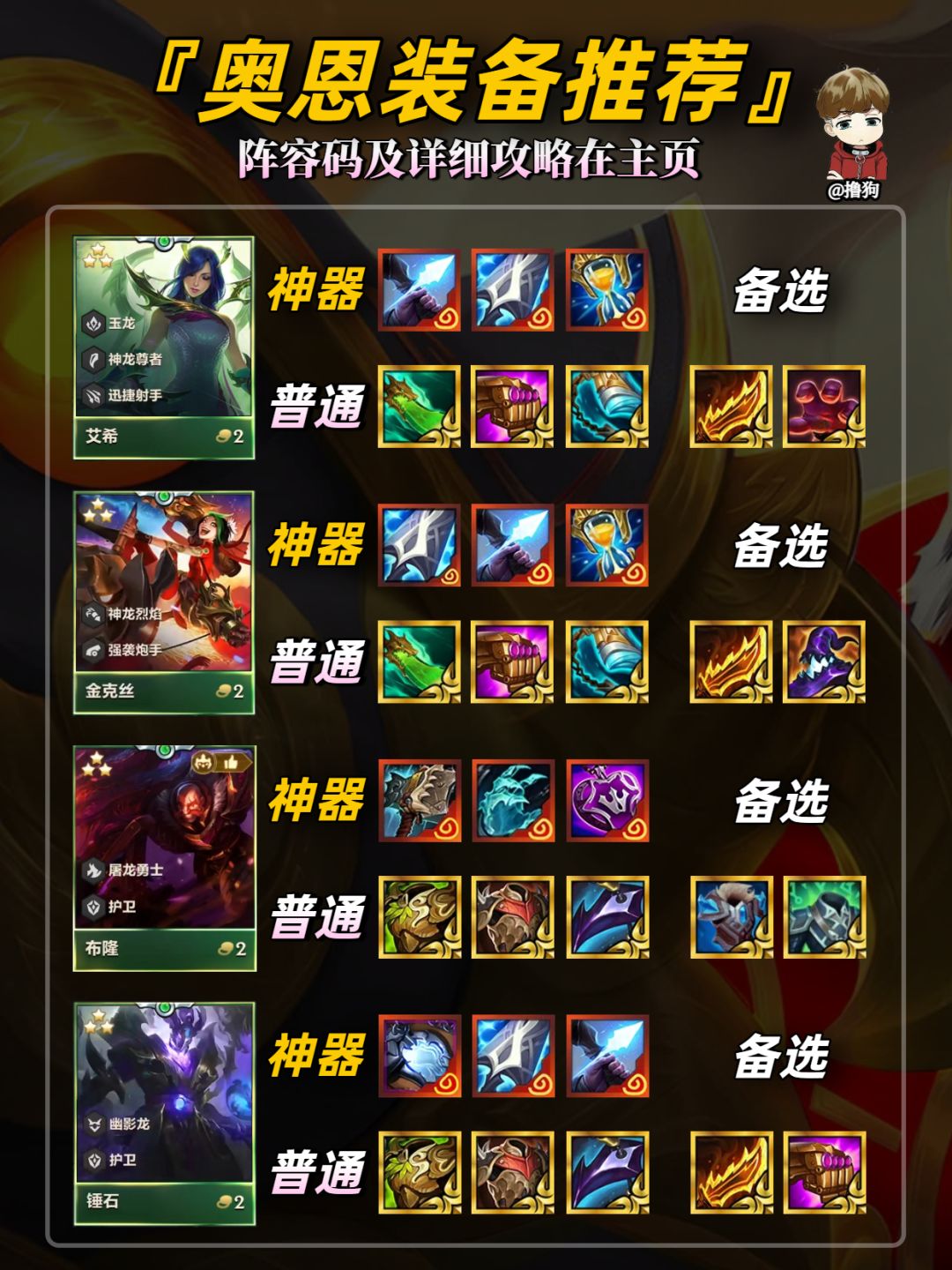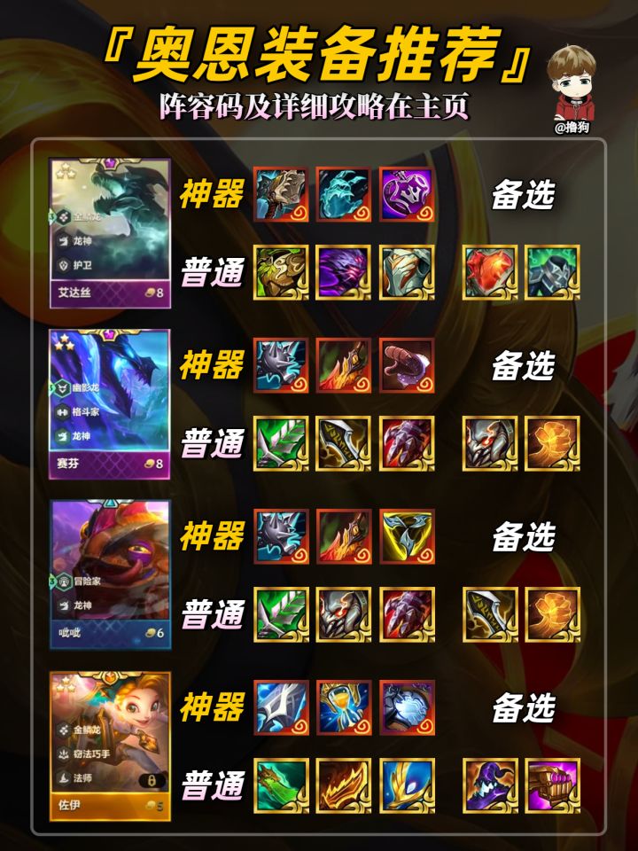 公众号【爱下棋的撸狗】有全部阵容攻略及代码,每日更新阵容榜单,下棋攻略