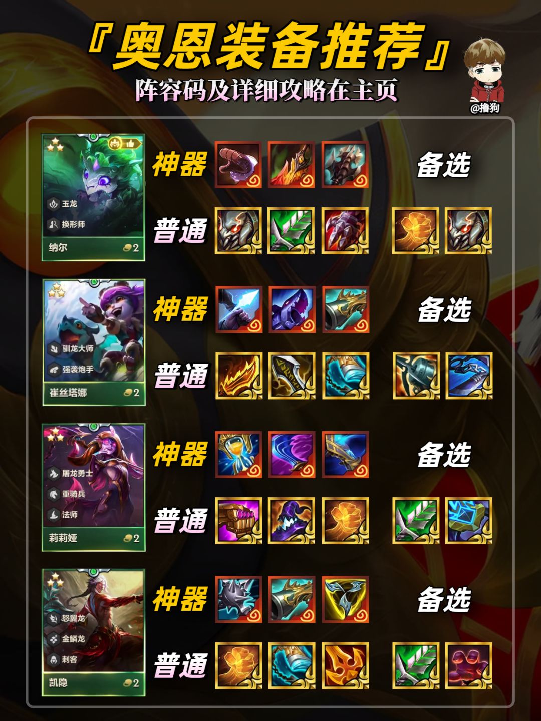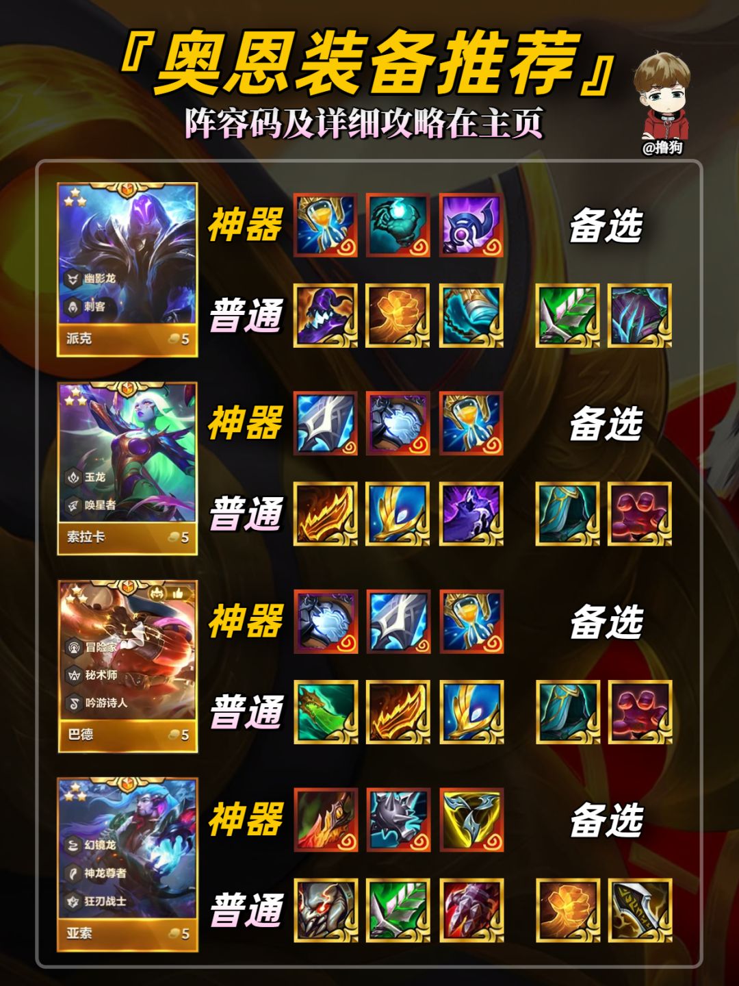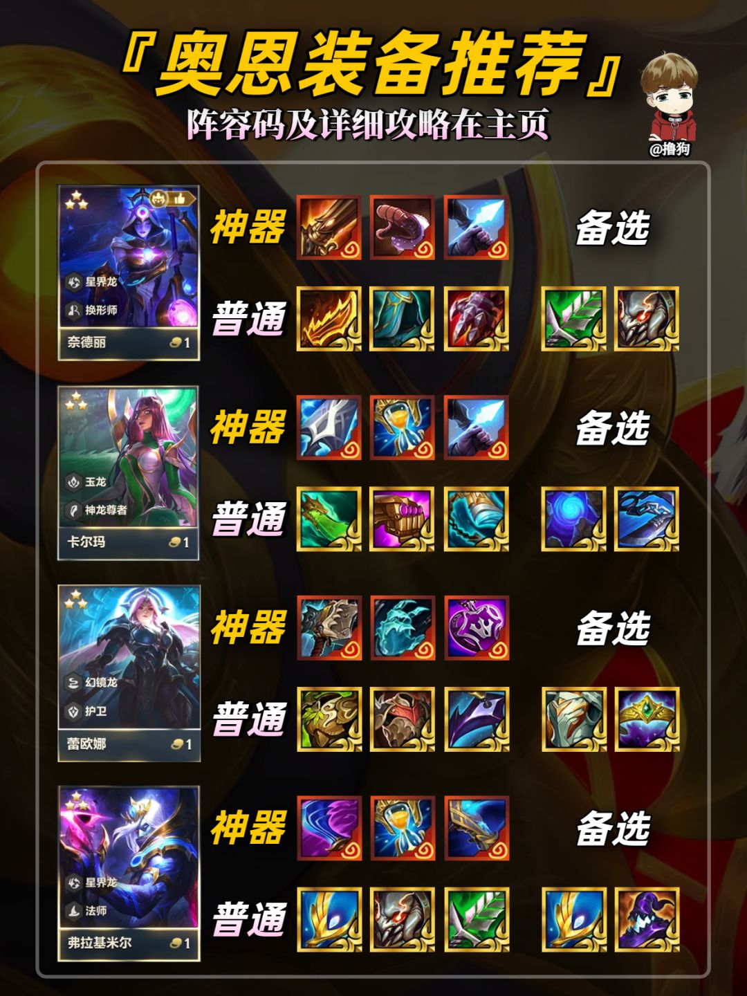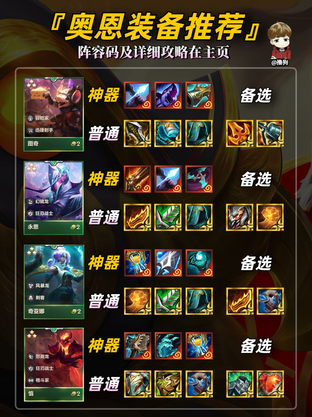 公众号【爱下棋的撸狗】有全部阵容攻略及代码,每日更新阵容榜单,下棋攻略
