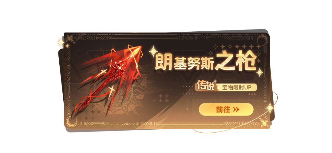 活动期间,在限定夺宝活动中使用【命运号角】召唤传说宝物,将必定获得全新传说+品质神器【朗基努斯之枪】系列宝物!