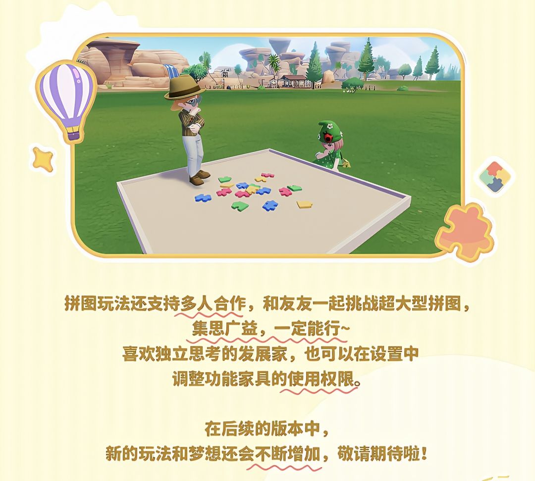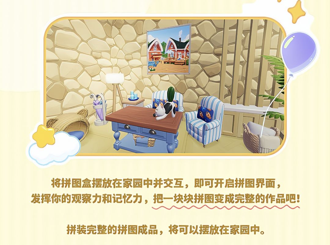 拼图玩法还支持多人合作游玩,完成拼装后,还可以将成品摆放在家园中进行展示,装点你的家园。