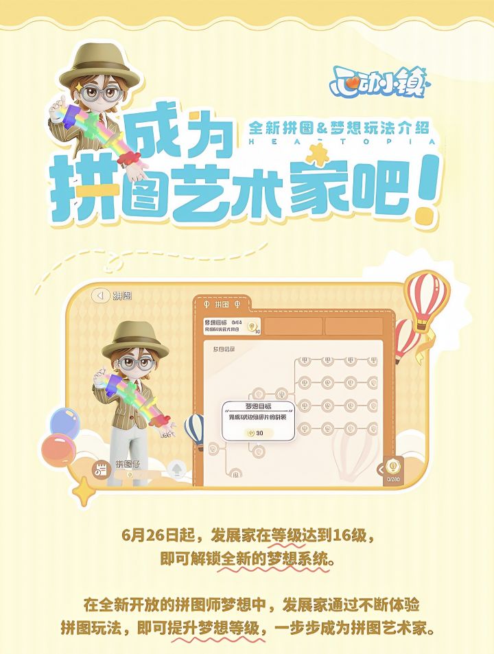 通过不断体验拼图玩法,提升梦想等级,成为拼图艺术家。