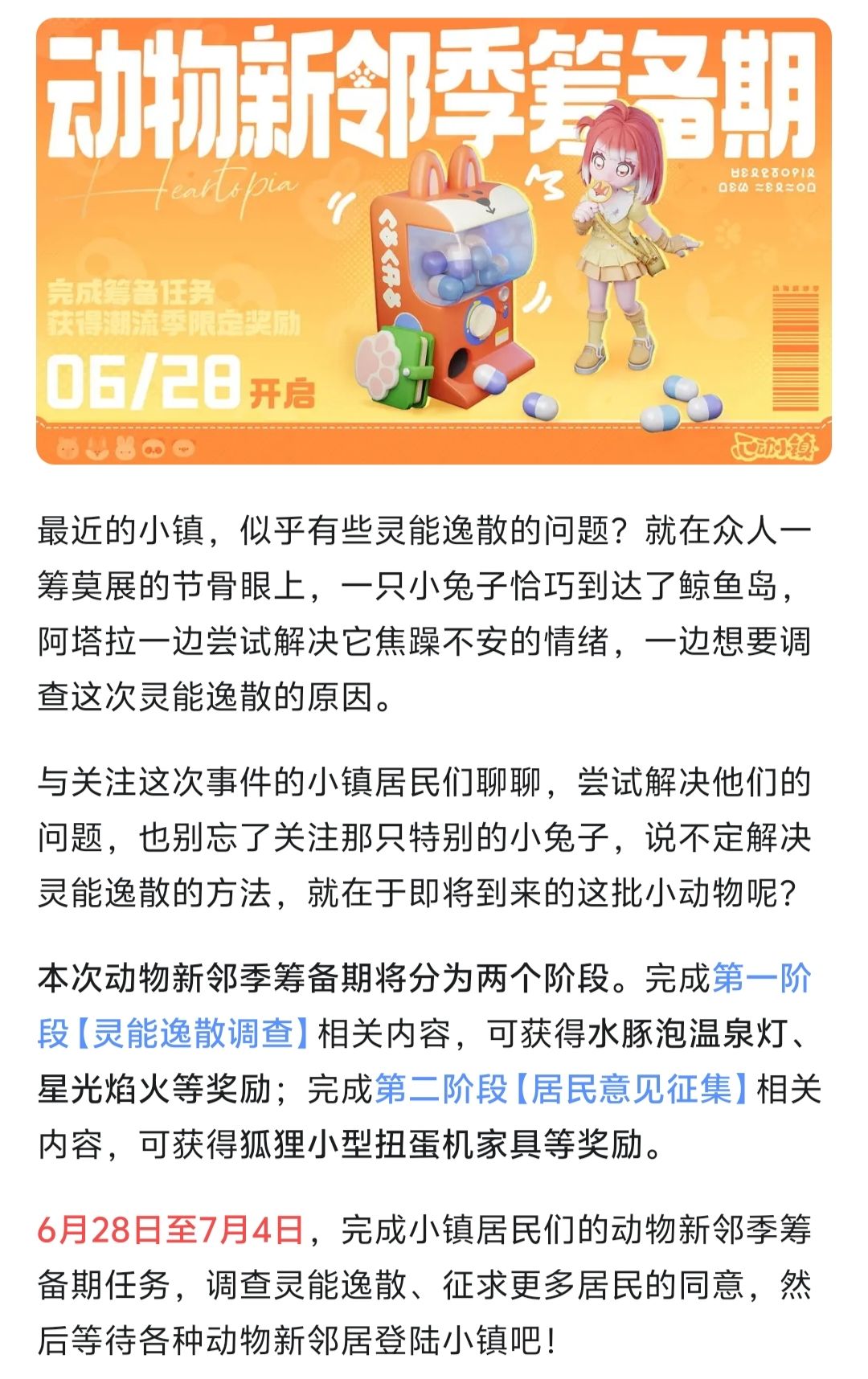 完成小镇居民们的动物新邻季筹备期任务,调查灵能逸散、征求更多居民的同意,等待各种动物新邻居登陆小镇。