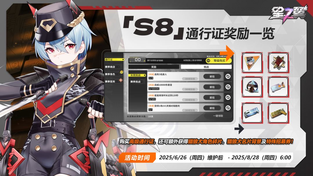 团长们好,阿猫带来了S8赛季通行证奖励内容。通过解锁高级通行证可获得额外奖励: