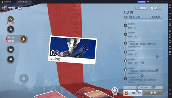 技能是奥特曼战斗的关键手段,强化技能能大幅提升角色的战斗能力。不同奥特曼都有独特的技能体系,有高爆发的光线技能,如赛罗的集束射线;也有控制、辅助类技能。在技能升级时,要根据奥特曼的定位和自身战斗风格来选择。输出型奥特曼,像赛罗、迪迦,优先升级主力输出技能,让伤害更上一层楼。升级技能需要消耗技能升级材料,可通过每天刷 “虚空之痕” 副本获取,一定要合理规划,优先保证核心输出角色的主力技能升满。