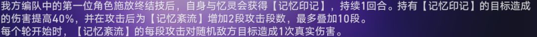 buff;开完大后自己和忆灵获得一层持续一回合的40%增伤buff,持有buff的单位造成伤害后会增加2层【记忆紊流】,最多10层,回合开始对敌方清空层数对敌方随机造成基于最大生命值上线的百分比伤害