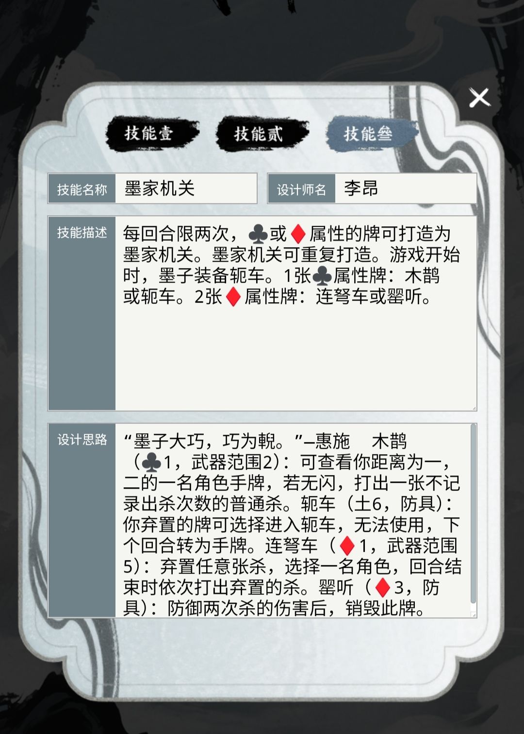 一技能因为是当一名角色,所以可以指定自己为目标,当然代价就是如果拼牌输了会挨多一刀。武器木鹊是给查看的角色来上一刀不占出杀次数的虚拟杀,但是我记得这游戏没有虚拟杀这个概念,所以就没加虚拟上去了,怕管方不给过。我设计这这版墨子大概就是保镖+打兵器的武将方向(什么男版孙尚香),有轭车和二技能不怕弃牌,就是怕拆顺。#游戏日常 #![[表情_送花]](https://img.tapimg.com/market/images/68b3dc8473df915ad2b85da5efef4f56.png)