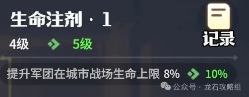 4、生命注射:生命注射可以提升军团城市作战的生命上限,为攻占和防御市镇、聚落、关口等联盟城市提升战力。