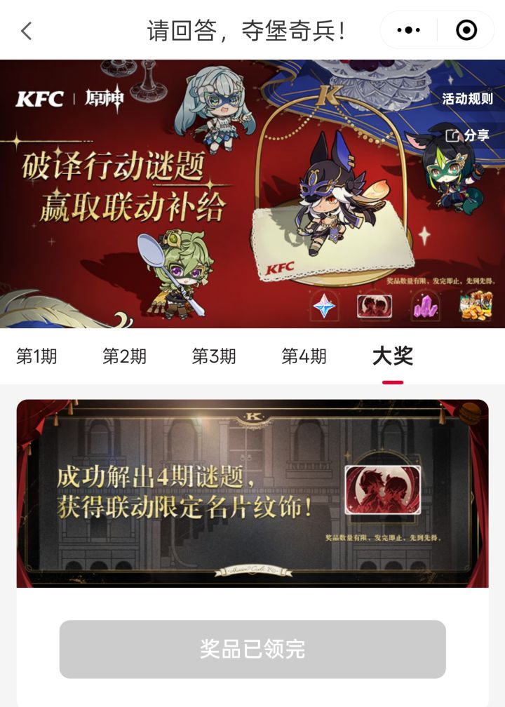 活动内容:活动期间,参与 活动一 的四期答题并全部输入指定正确口令(好友帮答成功视为输入指定正确口令)的用户有机会获得 肯德基丨原神 解密奖励游戏礼包五1张,共限量300万张,领完即止。