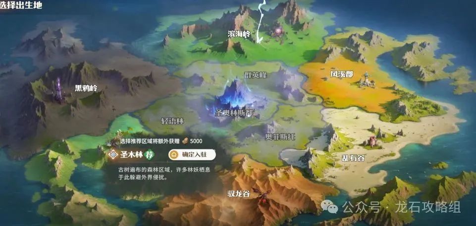 1. 落洲跟随公会选择要入驻的出生洲落地,散人玩家可选择推荐落洲可多5000石头资源