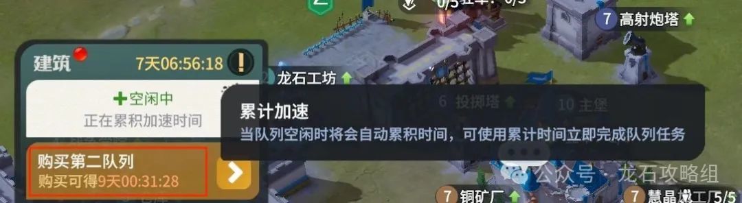 3. 开荒必备建筑的空闲时间在不升级建筑时会自动积累,不需要一直保证有建筑在建,也降低了肝度,另外第2队列必须购买,累计加速两个队列可叠加累计时间,所以新手期第一时间金币足够388以后直接购买即可