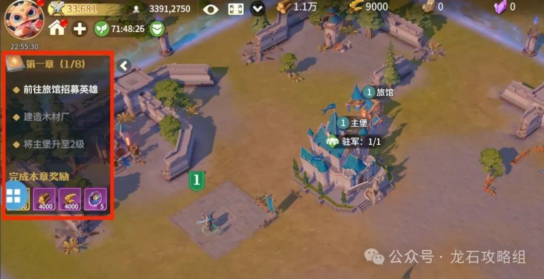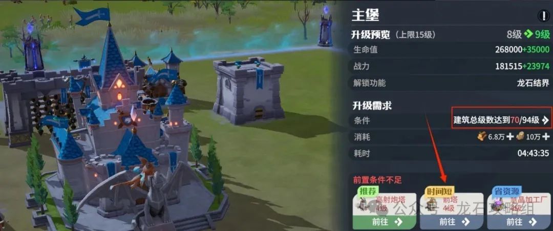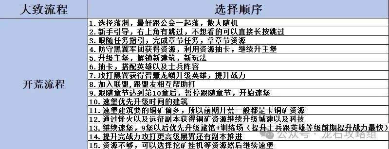 达到10章后,就不用跟着新手任务走了,接下来就可以开始速堡发育了,优先升堡等级,速堡流优先点橙色推荐,时间短的建筑优先,快速满足升堡条件,这样能更快的速堡提升战力,打高级黑翼达到极限发育的效果
