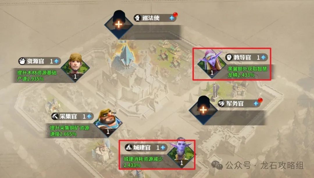 内政官记得升星,升级,优先升级额外智慧龙鳞的军务官跟减少城建资源的城建官