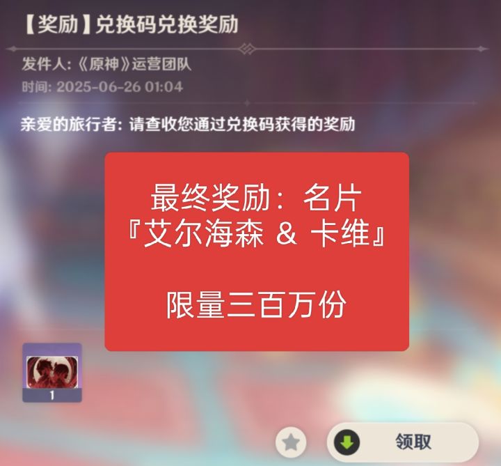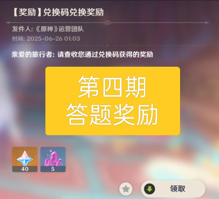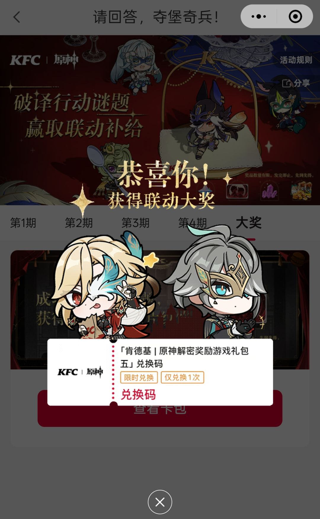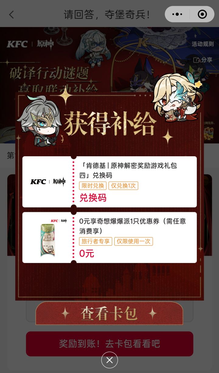 活动时间:2025年6月26日~6月29日。活动期间,答对前置活动四期题目的用户有机会获得 肯德基×原神。解密奖励游戏礼包五1张(名片),共限量300万张,领完即止。