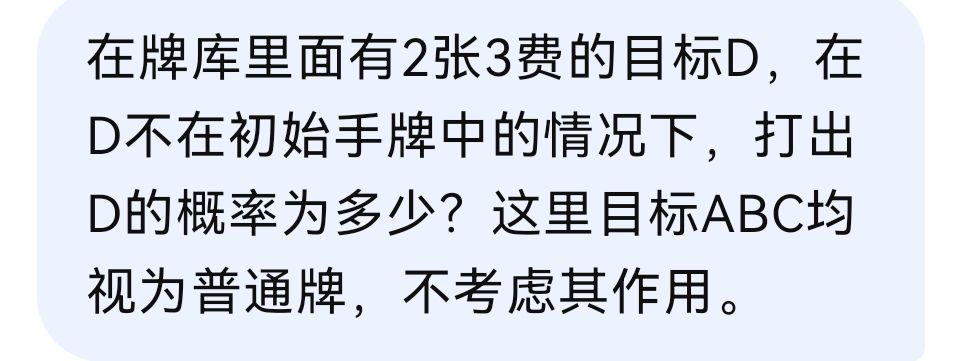 ,这里设定解场卡为2张暴风破2张双姬2张威廉,换牌换到解场卡概率为31.04%,然后通过抽牌的话,能打出暴风破概率为77.53%,双姬概率59.40%,威廉概率55.32%。2.开门找回血,这时候回血不在起始手牌,算出概率为30.14%
