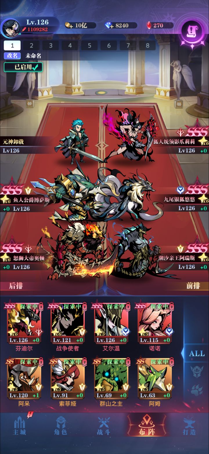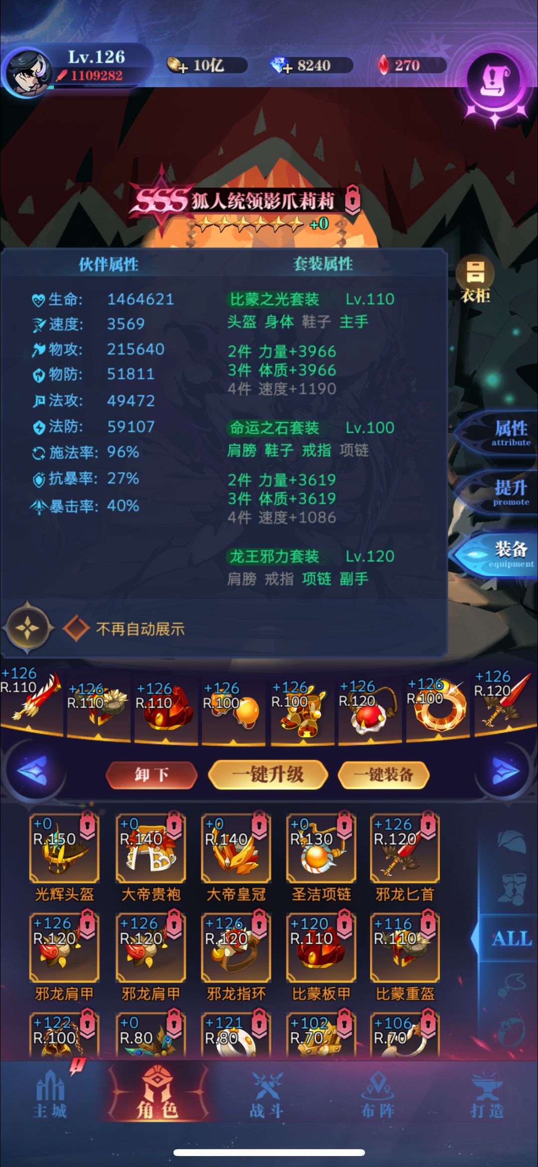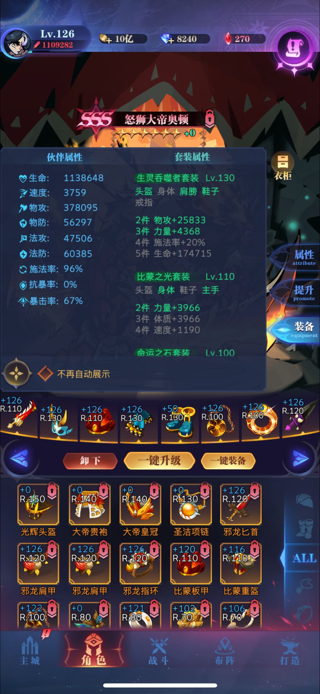 先说一下基本情况,自建号资源有限,还好这个区有周年活动。毕业装备是一套比命生,四套比命邪,还不是全满施法,男主捡破烂,双技能93施法。神器除了怒狮是满的两血两攻,其它都是两个100级血,sss就出了这几个,出卡顺序是:怒狮-悠悠-小黄人-鱼人(集字先换了迷宫币)-狼人-亲王-祭司-莉莉(出完祭司莉莉才回图鉴馆)-诺诺(这个没用过)。
