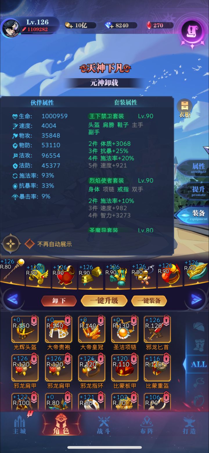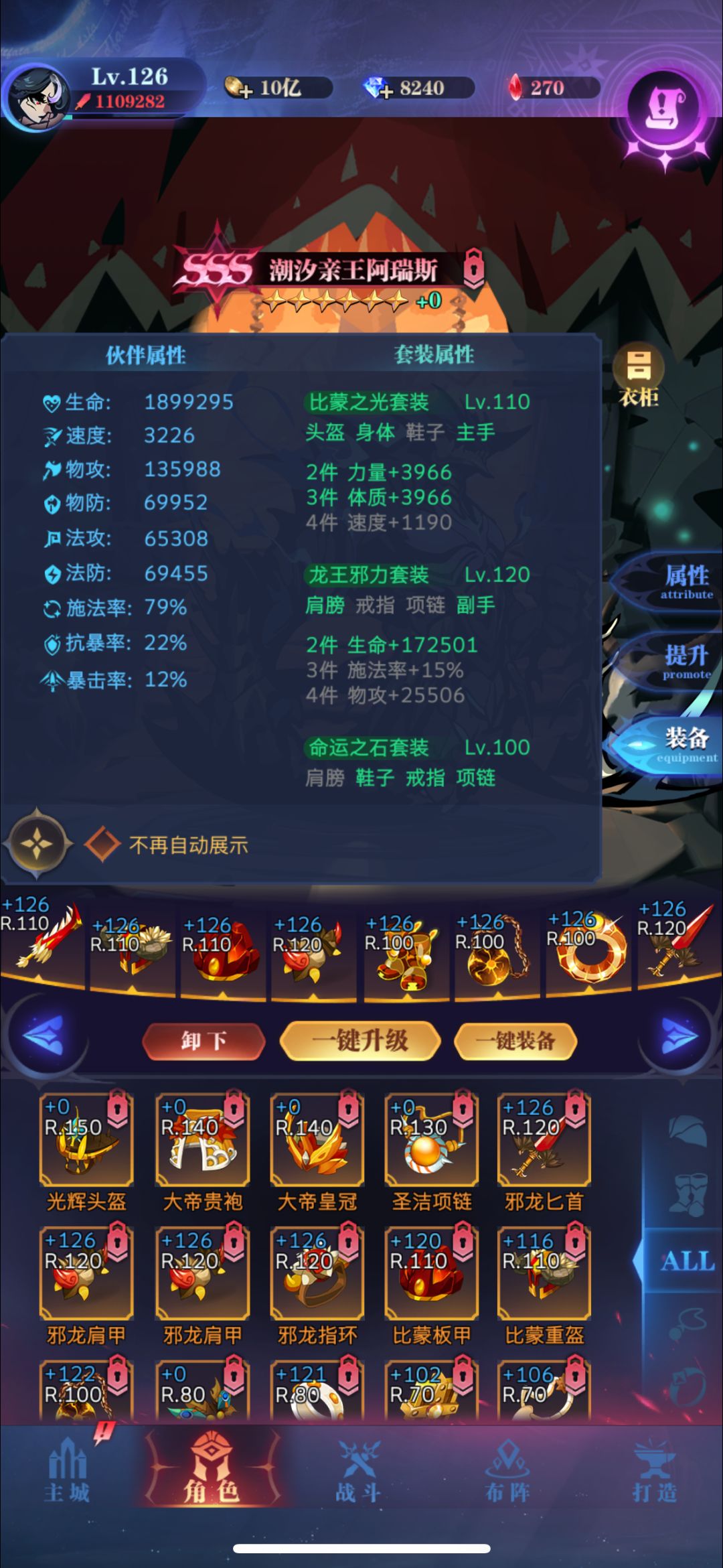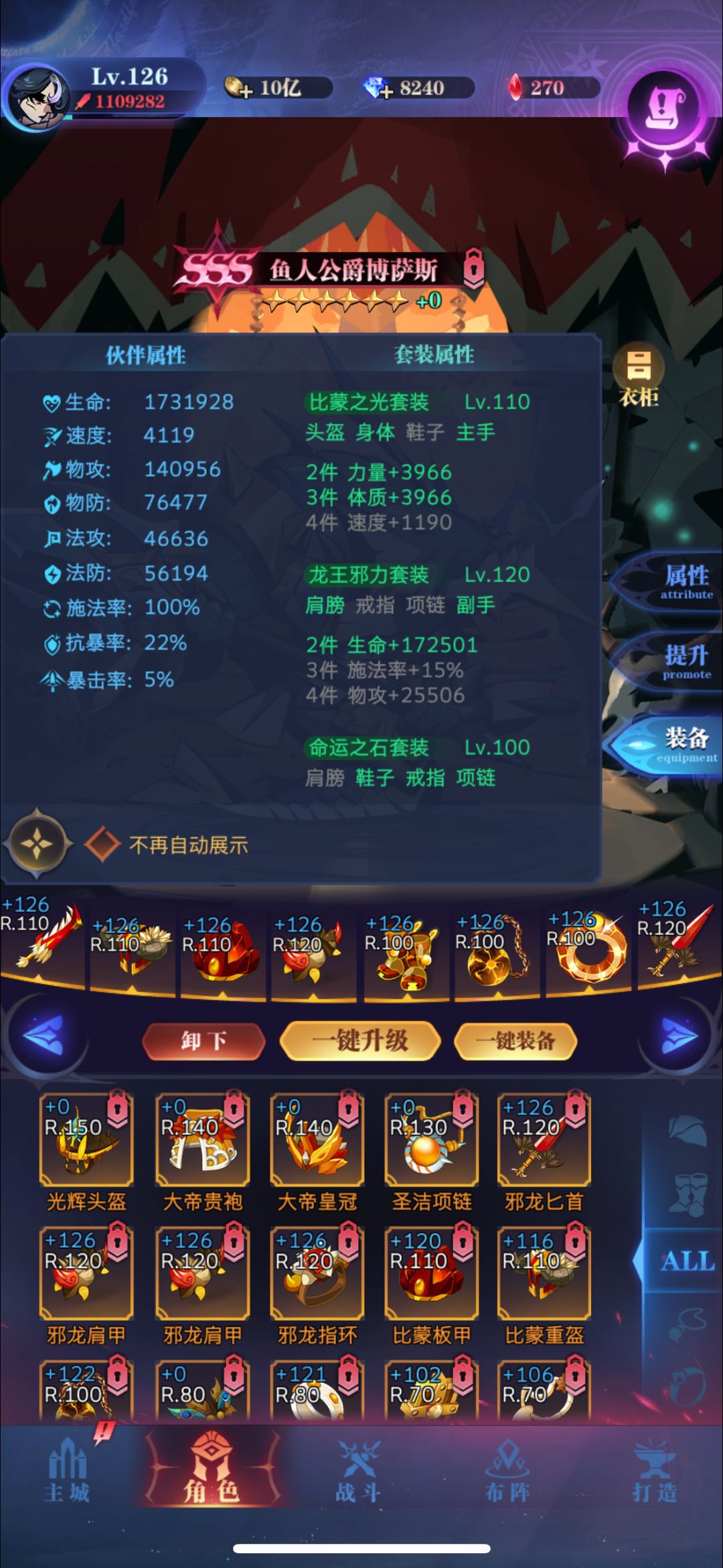先说一下基本情况,自建号资源有限,还好这个区有周年活动。毕业装备是一套比命生,四套比命邪,还不是全满施法,男主捡破烂,双技能93施法。神器除了怒狮是满的两血两攻,其它都是两个100级血,sss就出了这几个,出卡顺序是:怒狮-悠悠-小黄人-鱼人(集字先换了迷宫币)-狼人-亲王-祭司-莉莉(出完祭司莉莉才回图鉴馆)-诺诺(这个没用过)。